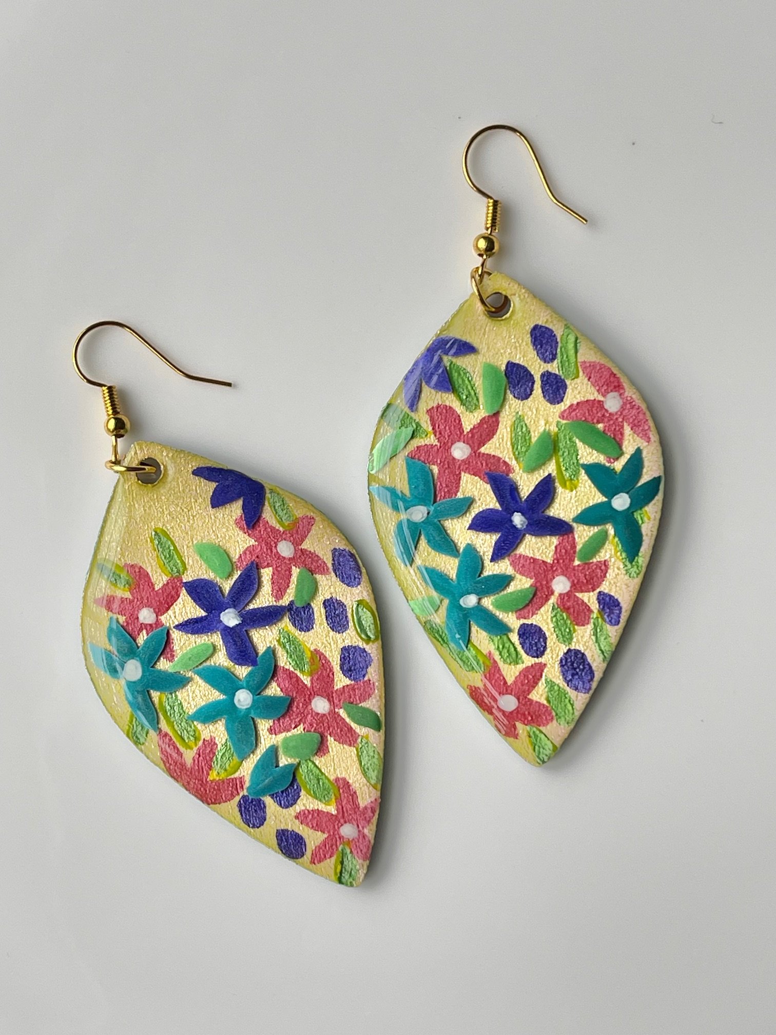 Hand Painted flower earrings. Each earring is unique and hand painted by the artist. The earrings are made of acrylic paints wood and resin and are crafted to create an illusion of floating flowers.