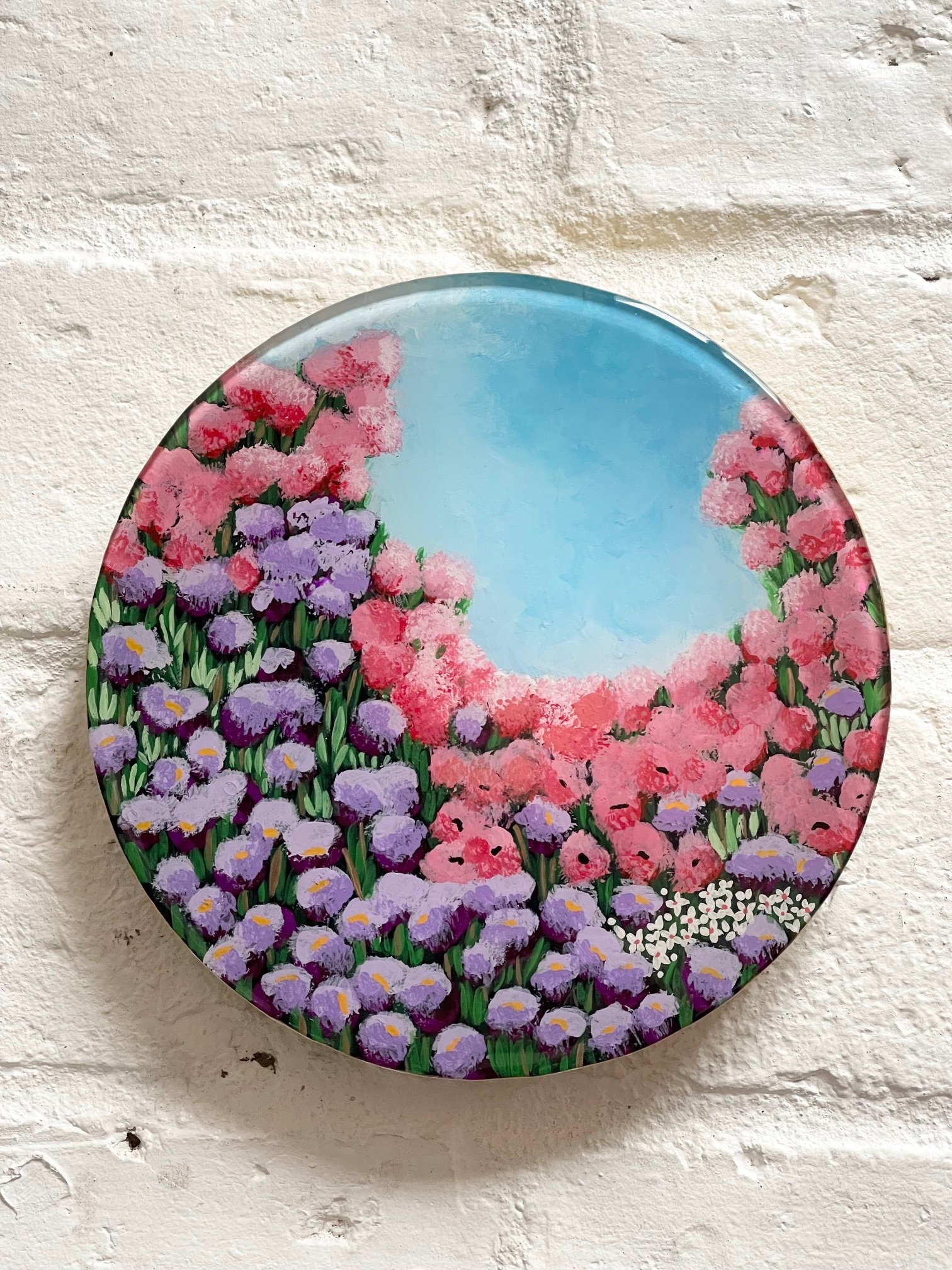 One of a kind original painting. 8" wood panel coated with a shiny coat of resin.