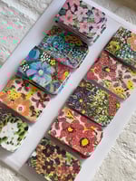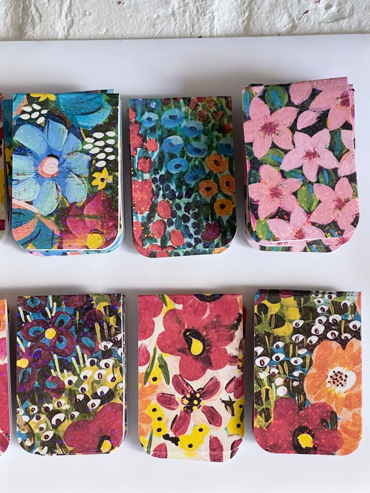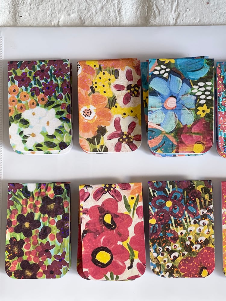 Magnetic bookmarks featuring my artwork. The bookmarks measure about 2x3 inches.