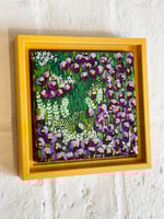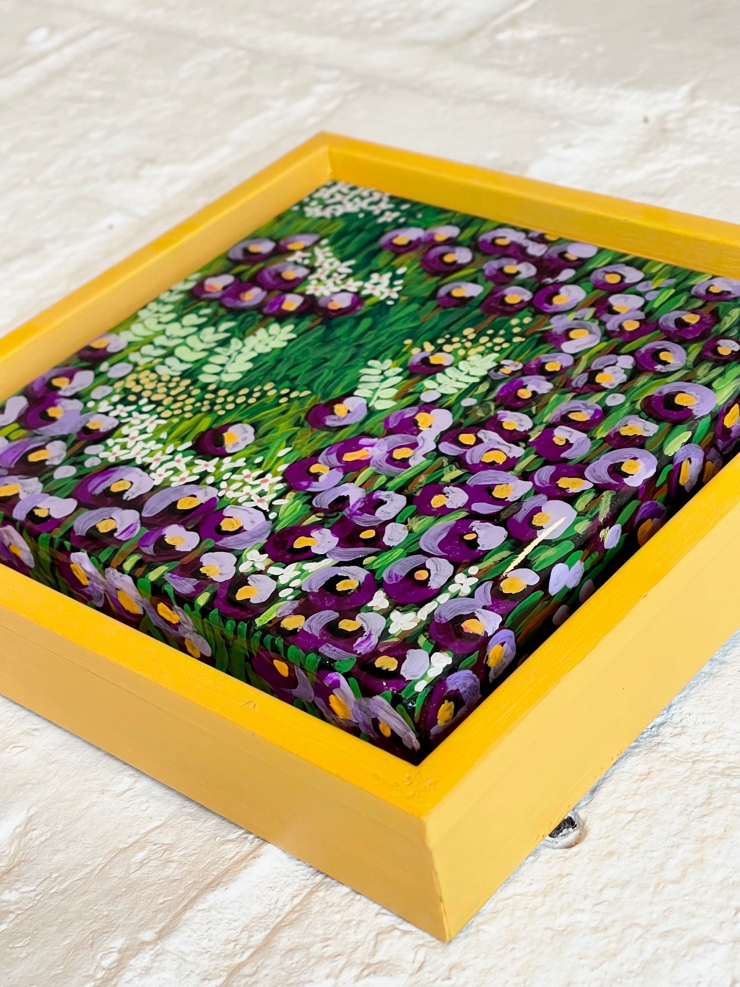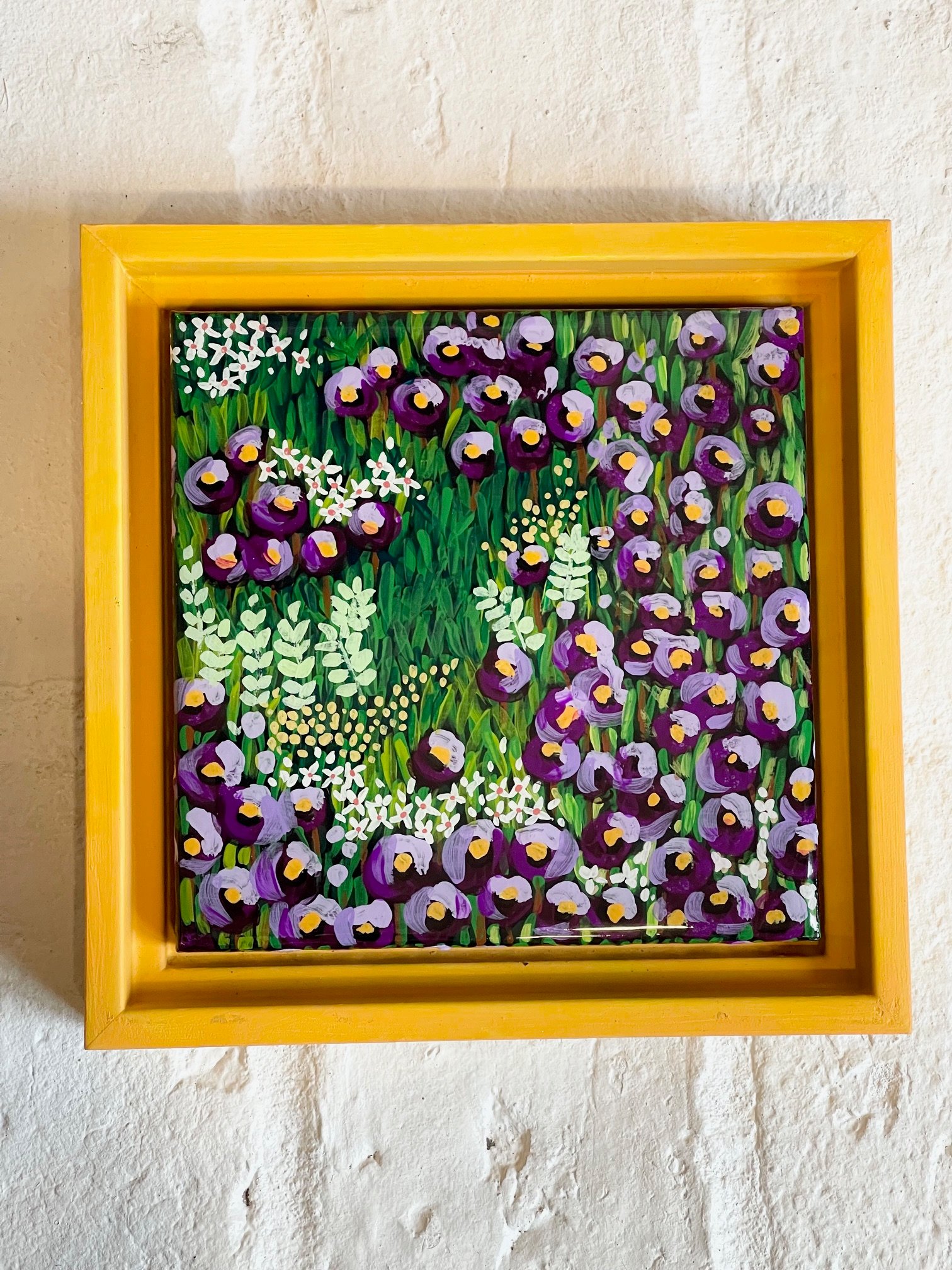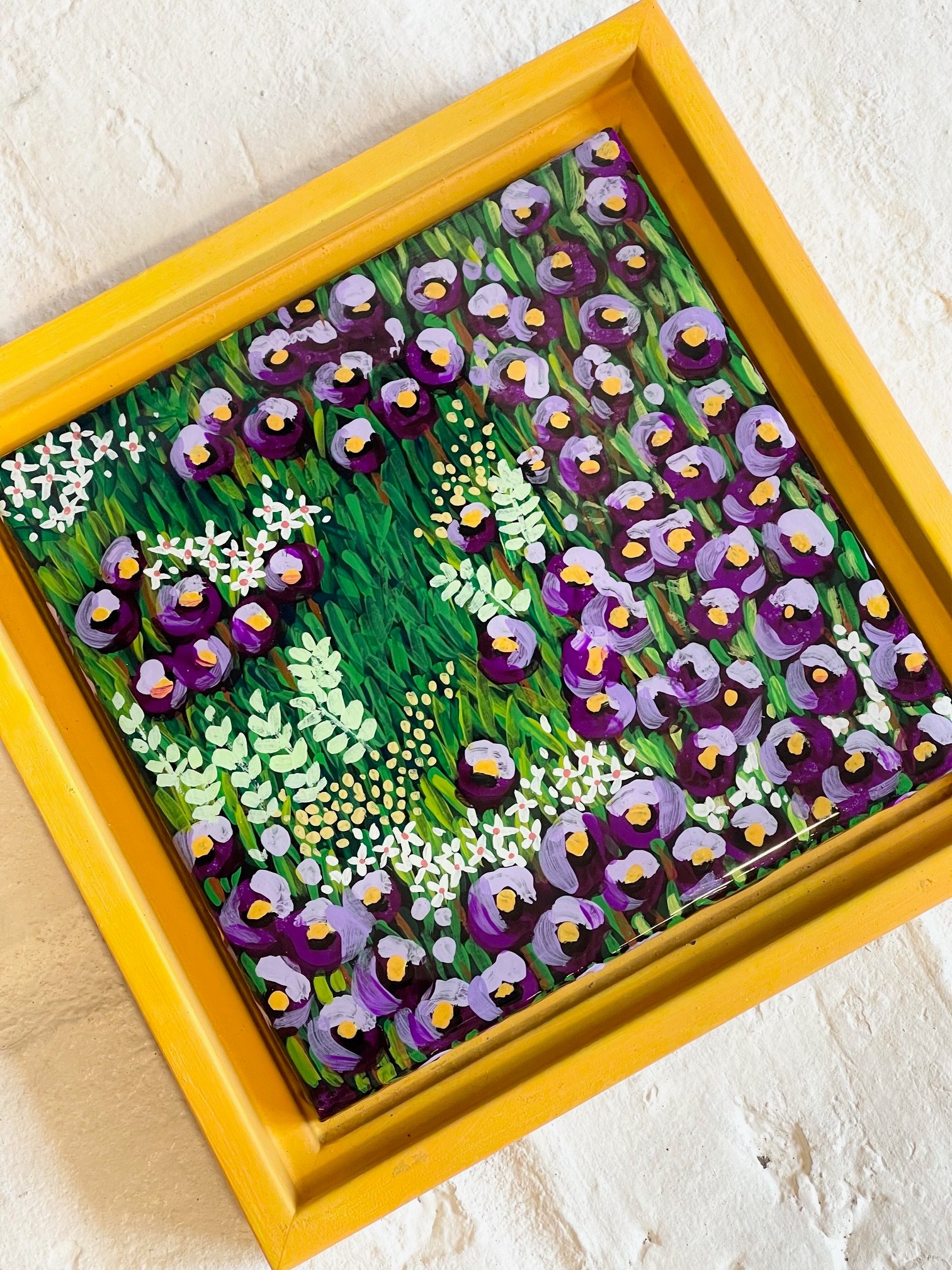 One of a kind original painting. The artwork depicts a field of purple and white wildflowers. This hand painted wood panel is coated with a shiny coat of resin and comes framed in a yellow hand-painted acrylic frame.